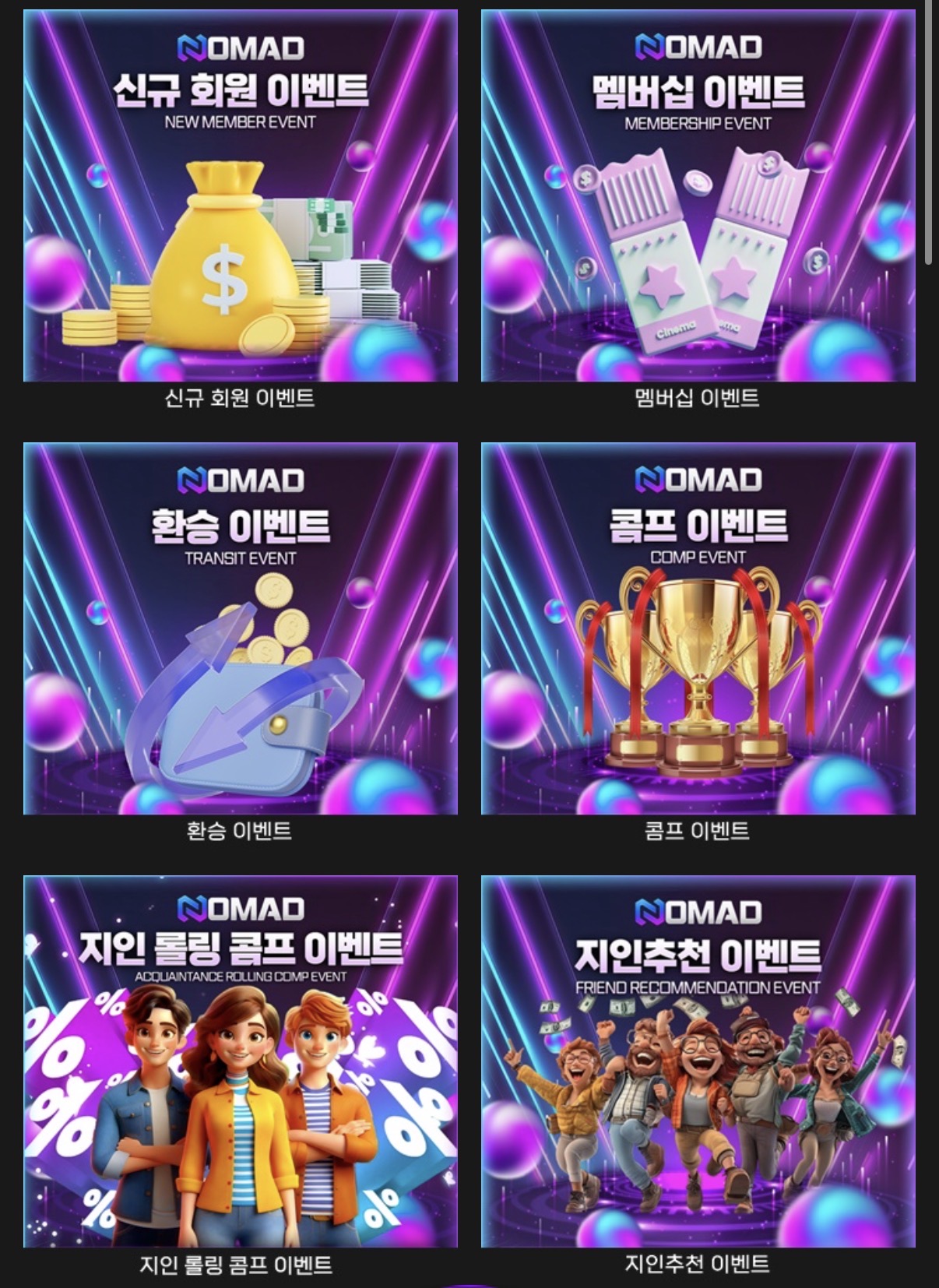 노마드 사이트 지인추천이벤, 첫충전이벤트 매충전이벤트 텔레친추이벤 등등 사이트에 참여할수있는 이벤트가 많아서좋아요 충환전도 진짜 빠르고 실시간 스포츠경기들도 많이 있고 미니겜도 많이있어서 다들 한번씩 사대맞추러와보세요~!