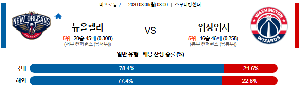 2026-03-09 08:00 NBA 뉴올리언스 펠린컨즈 vs 워싱턴 위자드