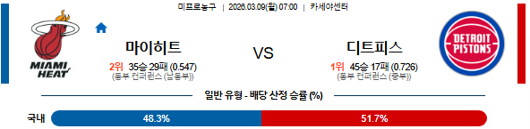 2026-03-09 07:00 NBA 마이애미 히트 vs 디트로이트 피스톤스