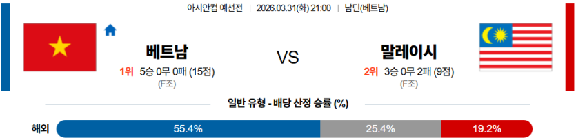 동남아시아 무대에서의 홈 앤 어웨이 데이터적인 측면에서도 베트남의 승률 기대치가 더 높게 형성되는 편이고, 실제 경기력 역시 말레이시아보다 안정감이 확실히 낫다.
