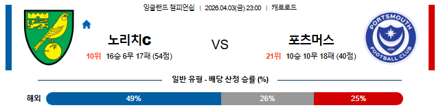 2026-04-03 23:00 잉글랜드 챔피언쉽 노리치 시티 FC vs 포츠머스 FC