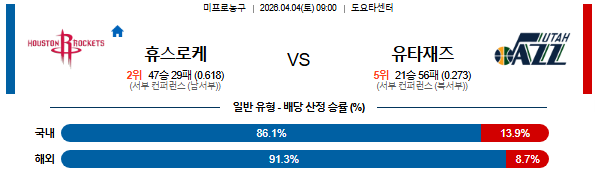 2026-04-04 09:00 NBA 휴스턴 로켓츠 vs 유타 재즈