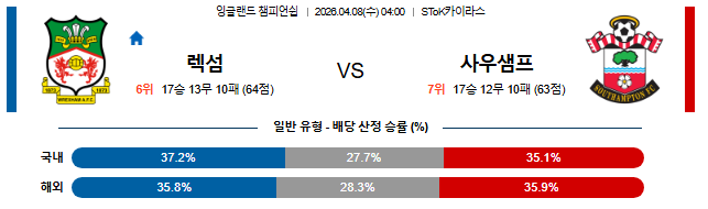 2026-04-08 04:00 잉글랜드 챔피언쉽 렉섬 vs 사우샘프턴
