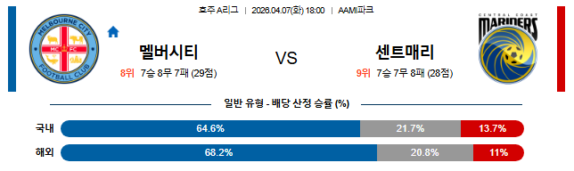 2026-04-07 18:00 호주 A리그 멜버른 시티 FC vs 센트럴 코스트 마리너스 FC