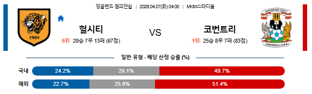 2026-04-07 04:00 잉글랜드 챔피언쉽 헐 시티 AFC vs 코번트리 시티