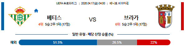 결국 이번 2차전은 베티스가 라 카르투하에서 주도권을 틀어쥐고, 후반 결정 구간에서 브라가 수비 간격을 무너뜨리며 승부를 가져갈 가능성이 높다.