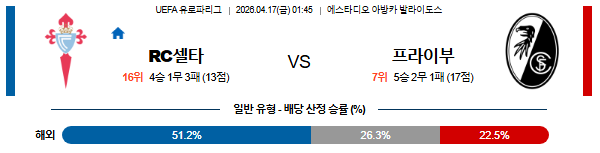 그래서 이번 경기는 프라이부르크의 다음 라운드 진출 가능성과 별개로, 90분 결과 자체만 놓고 보면 셀타비고가 더 적극적으로 밀어붙이며 근소 우위를 만들 가능성이 높다.