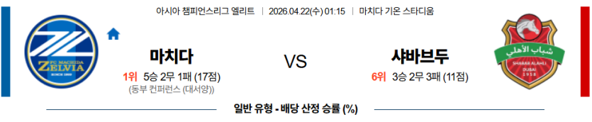 2026-04-22 01:15 AFC 챔피언스리그 마치다 젤비아 샤바브 알아흘리 두바이
