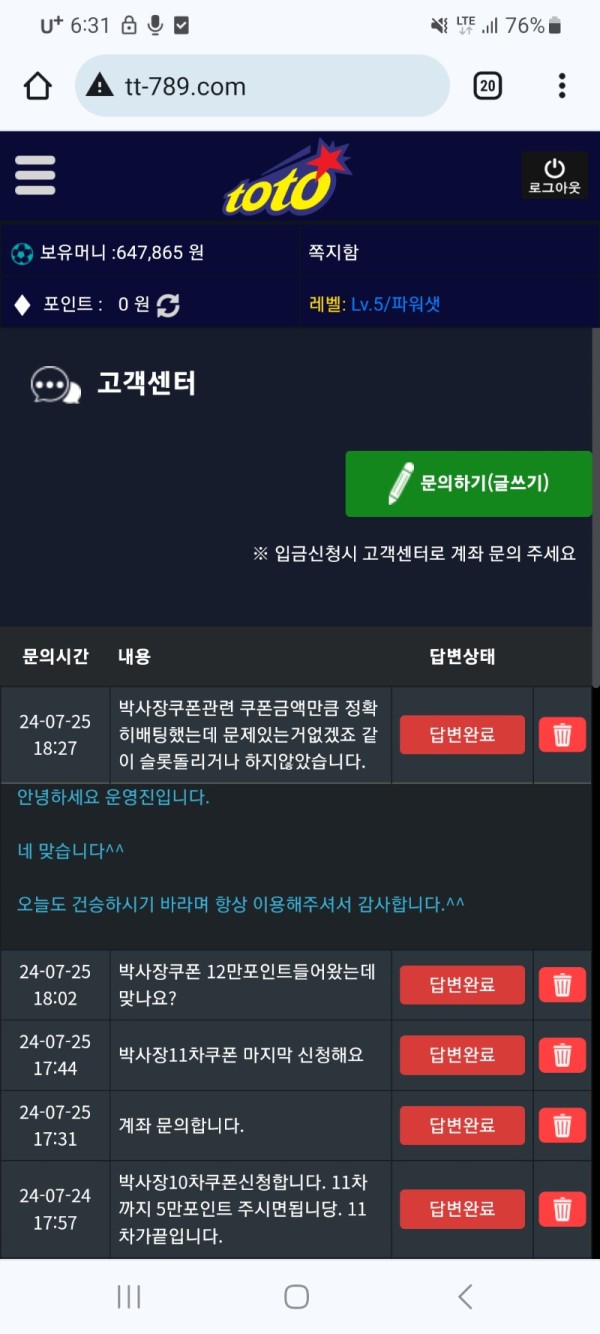 이사비 총 60 11일동안나눠서 주고 입금할때마다 하루 한번씩 5만스포츠 쿠폰 준다하여 가입