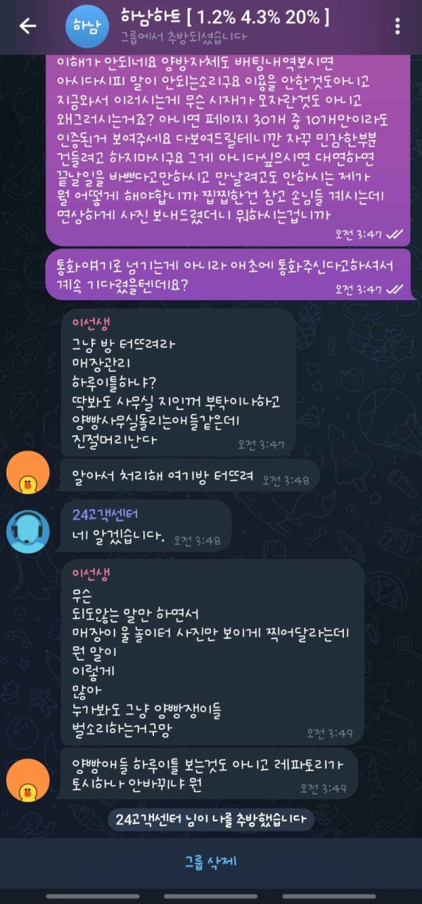 명분을잡아대더니 사진 요구하는 인증샷들 보내주고 인증되니까 일단 환전취소처리해드릴테니까 배팅 조금 하고계시면 본사한테 연락올거다라는 개소리시전 그러다 뭐 하나 잡을꺼 없으니 양빵이다