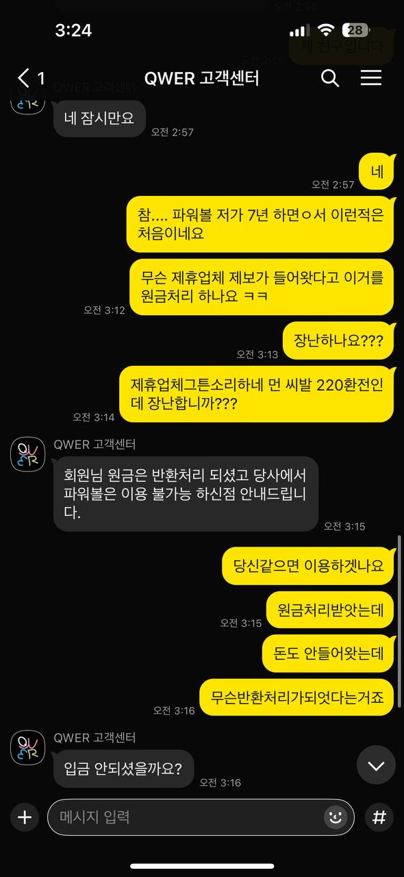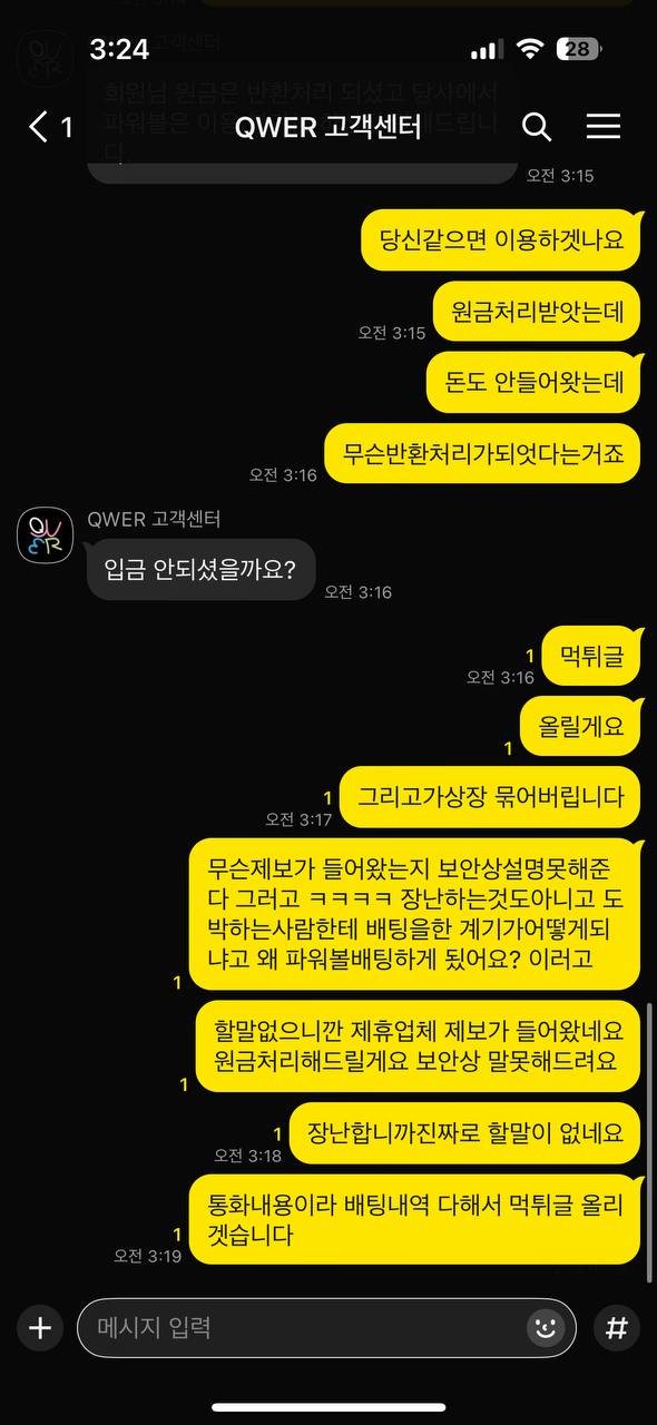 요기 qwer 개십먹싸네요 30충222만 환치니깐 입금내역보내라해서 보내고 저게뭔지 다설명하라해서 햇는데 한참뒤에 전화오더니 사장님 저희 제휴사이트에서 제보가 들어왔어요 보안상 자세하게는 말씀못드리고 원금처리해드릴게요 이지랄하네요 ㅋㅋㅋㅋㅋ진짜 어이가없어서 그냉 좆 구멍가게200만원도없는사이트입니다 앞으로 저희사이트 파워볼은 이용불가하세요 이지랄하고서는 배팅내역 캡처 환전내역캡처해서 먹튀글 올린다니깐 계정차단 ㅋㅋㅋㅋㅋㅋ 뭐가 킹기는게있으니 그러겟죠 떳떳하면 올리든말든 무슨제보인지 설명도안해주고 그냥 어떤말을 하든 원금처리되실거에요~ 이지랄하네요 절대쓰지마세요