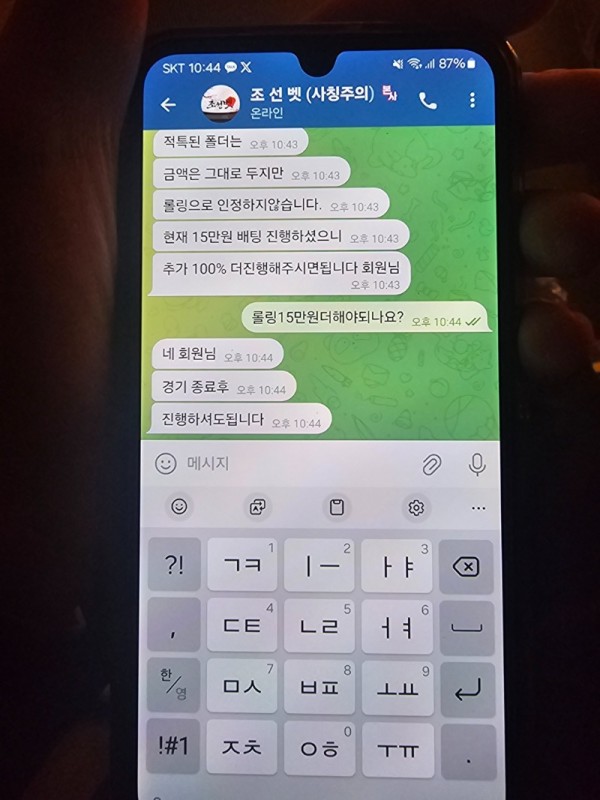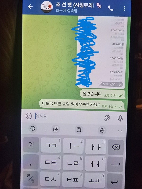 환전 롤링을 물어보니 텔레로 문의하라 한다길래 사진찍어 놓으라 하길잘했네 구멍가게야 롤링 400%다.